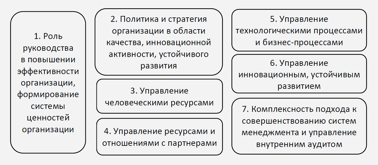 1 группа критериев – использование принципов менеджмента качества, инновационной активности и устойчивого развития деятельности организации: